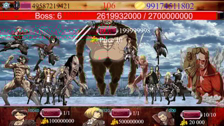 Em Attack of the Titans Idle, VOCÊ assumirá o controle de uma equipe de personagens para derrotar uma série de chefes formidáveis. Você encontrará vários locais exclusivos, vários oponentes e um sistema inovador de atualização de personagens. Este jogo é projetado para adolescentes e amantes de anime, oferecendo uma experiência envolvente que combina a emoção de um jogo clicker com planejamento estratégico. Com desafios infinitos e a capacidade de jogar no desktop ou no celular, Attack of the Titans Idle garante que sempre haja uma nova aventura esperando por você.