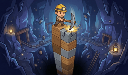 Faça sequências de escavações corretas. Construa o multiplicador. Erre uma vez e ele reseta. Fique atento aos blocos especiais: TNT explode vizinhos (progresso livre), Teias te deixam lento (supere rápido), Ouro concede moedas, Gelo escorrega ao ser atingido (planeje o ângulo), Rocha Matriz exige 3 golpes, Baús geram bônus aleatórios — tempo extra, pontos ou ferramenta automática. Abra baús cedo para ter mais respiração.