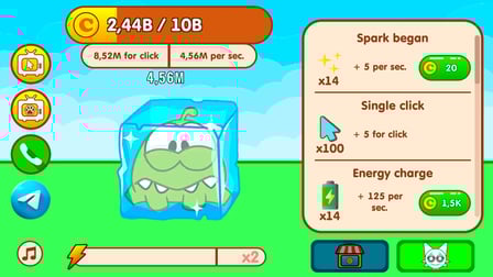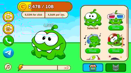 No computador, use o mouse para clicar no Om Nom na tela, ganhando moeda a cada clique. Em dispositivos móveis, toque na tela para gerar moeda e evoluir seu personagem. Seus toques ou cliques são essenciais para a progressão, então continue chegando!