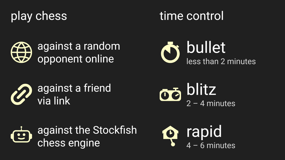 Xadrez rápido apresenta três controles de tempo: bala de❷, psorblitz, e psorrápido, atendendo a uma variedade de estilos de jogo.