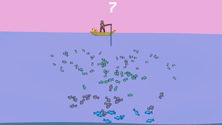 O objetivo é pegar o maior número de peixes possível antes que o tempo acabe, competindo contra um amigo!