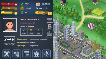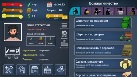 O jogo se baseia principalmente em clicar e tocar. Use o botão do mouse ou o dedo para interagir, coletar itens e iniciar ações como procurar trabalho ou interagir com outros personagens. Gerenciar a saúde e os recursos do seu personagem envolve seleção estratégica de atividades, que você pode navegar facilmente com alguns cliques ou toques.