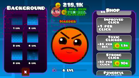 Prepare-se para uma emocionante aventura em Geometric Dash: Evolution to the Demon! Este cativante jogo online desafia os jogadores a clicar nos rostos dos personagens inspirados na amada série Geometry Dash. A cada clique, você sobe em direção a novas alturas de jogabilidade, desbloqueia melhorias e enfrenta desafios cada vez mais difíceis. Perfeitamente adequado para tanto fãs experientes de Geometry Dash quanto novos jogadores, este título gratuito oferece uma experiência viciante.