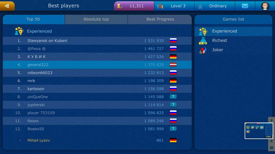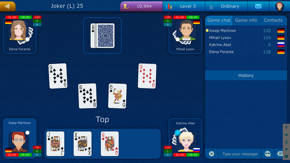 Joker é um emocionante jogo de cartas onde você pode jogar com pessoas reais. Aproveite a emoção de competir contra outros online gratuitamente sem fazer download e mergulhe na atmosfera de jogabilidade estratégica, interação social e diversão. Este jogo HTML5 baseado em navegador permite que os jogadores experimentem o clássico jogo de cartas Joker em um formato conveniente e acessível. Sem necessidade de registro, você pode mergulhar direto na ação e começar a jogar imediatamente. Seja você um jogador casual ou um entusiasta de cartas experiente, Joker oferece um ambiente dinâmico e envolvente para desafiar suas habilidades e conhecer novos amigos.