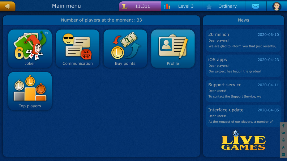 No Joker, você se juntará a uma comunidade de jogadores para mostrar suas proezas no jogo de cartas. Participe de partidas competitivas em várias mesas, cada uma oferecendo desafios e oponentes únicos. Com um sistema avançado de prêmios e conquistas, os jogadores podem ganhar reconhecimento e subir nas classificações dos jogadores para se tornar o campeão de cartas definitivo. O Joker foi projetado para jogadores de todos os níveis de habilidade, tornando-o um espaço acolhedor para novatos e aficionados experientes em jogos de cartas. O jogo é indicado para Jogadores com 18 anos ou mais, garantindo um ambiente de jogo maduro e respeitoso. Prepare-se para uma experiência envolvente com regras detalhadas, suporte ativo e inúmeras promoções para aprimorar sua jogabilidade.