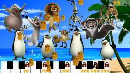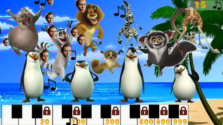 É um jogo musical onde os jogadores controlam pinguins para coletar notas que caem e criar música em um piano virtual.