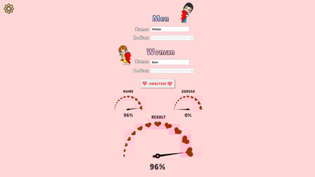 Comece inserindo os nomes dos jogadores e os signos do zodíaco para obter resultados imediatos de compatibilidade. Alternativamente, analise apenas os nomes ou signos do zodíaco conforme desejado. Além disso, participe do modo "combinar um par", onde você deve combinar itens masculinos e femininos correspondentes arrastando-os juntos. Essa mecânica simples o torna viciante tanto no celular quanto no desktop.