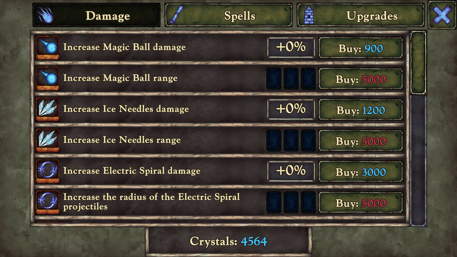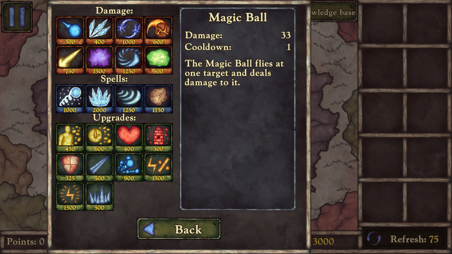 - Use o mouse para selecionar magias e upgrades
