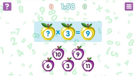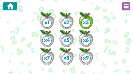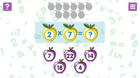 R: Use o modo de prática para se familiarizar com a tabuada e procure coletar o maior número possível de maçãs verdes para obter respostas corretas.