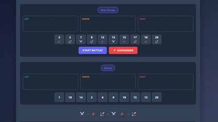 Comece sua jornada recebendo 10 números aleatórios ao iniciar o jogo. Você pode jogar no seu computador ou telefone, garantindo flexibilidade em qualquer lugar. Seu objetivo é organizar esses números nos três flancos disponíveis: Esquerda, Centro e Direita. Posicione estrategicamente suas tropas com base em suas forças para derrotar o inimigo em uma série de três rodadas intensas!
