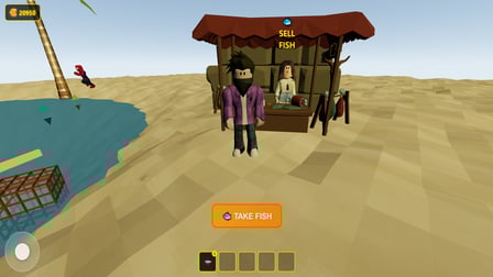Jogar Obby: Catch the Crab! é fácil e direto. No seu telefone, controle seu personagem usando um joystick virtual. Basta colocar suas armadilhas na água e monitorar as capturas. No computador, use o mouse para uma navegação e controle semelhantes. Assim que você pescar peixes, vá ao mercado e venda-os por moedas. Use essas moedas para melhorar seu equipamento para aventuras de pesca ainda mais eficazes!