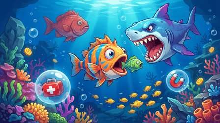 Pegue o Ímã. Cria uma frenesia de alimentação—atrai peixes próximos diretamente para sua boca. Com pouca saúde? Pegue um Kits de Primeiros Socorros. Precisa de proteção? Pegue o Escudo. Ignore esses power-ups por sua conta e risco. Eles são a diferença entre domínio e morte.