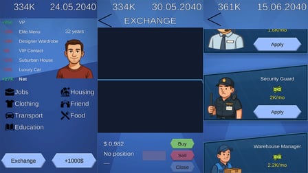 Domine a jogabilidade começando com uma estratégia clara de orçamento. Tome decisões calculadas sobre essenciais como alimentos e roupas e invista continuamente em educação para desbloquear um maior potencial de ganhos. Monitore o mercado em busca de oportunidades de negociação que podem impulsionar suas finanças!