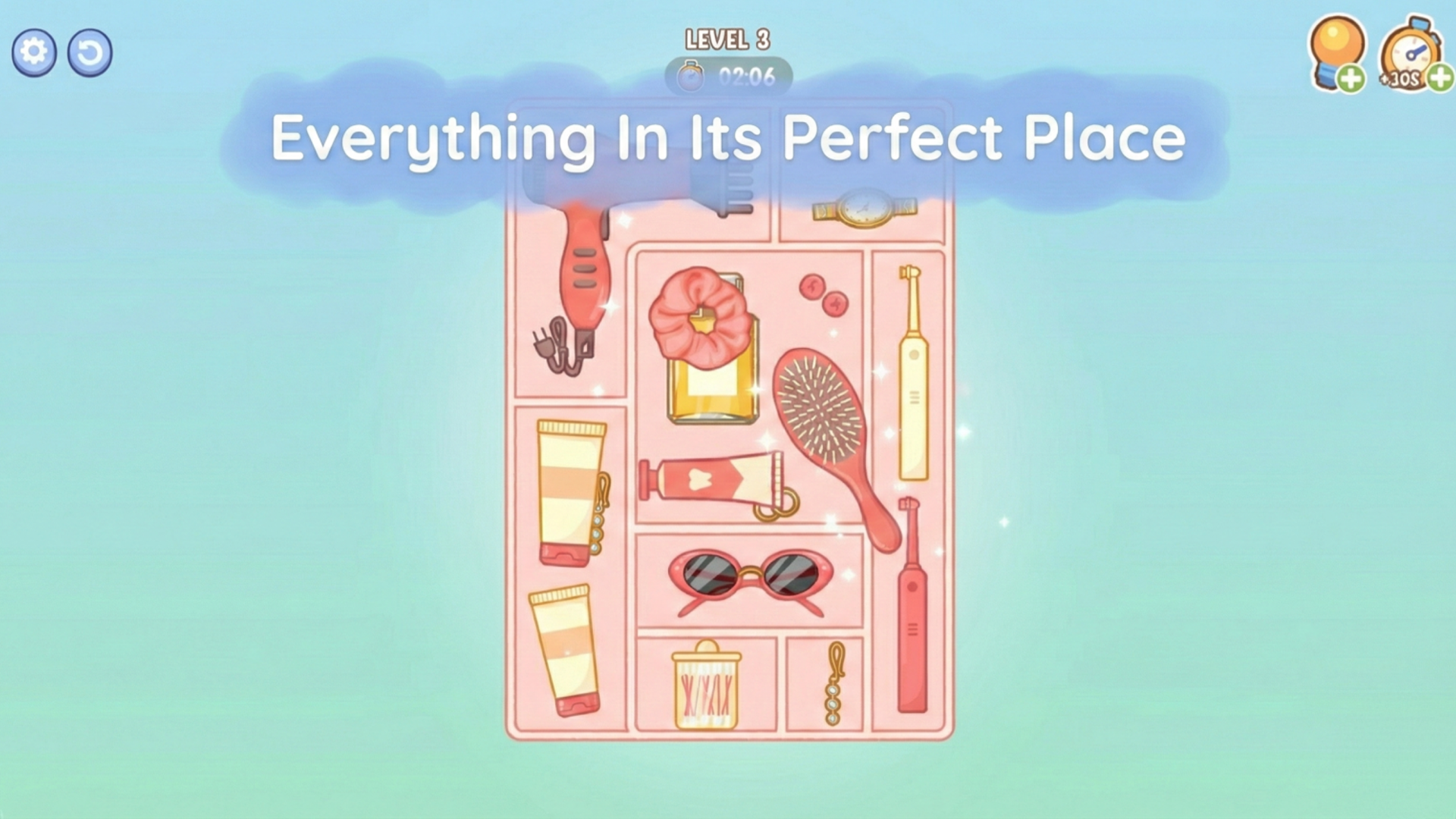 Outros níveis o jogam em um quebra-cabeça de empacotamento estilo Tetris. Você tem uma bandeja com slots específicos e um monte de objetos aleatórios – escovas de cabelo, óculos, loções. Arraste cada item para o lugar certo, girando se necessário, até que tudo se encaixe. O botão de dica (ícone de lâmpada) não custa nada, mas te dá um empurrão se você estiver preso.