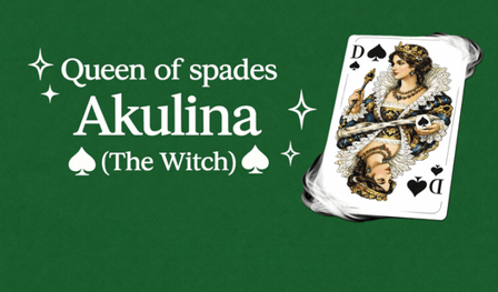 Jogo de cartas. Regras clássicas. Uma armadilha mortal. Queen of spades Akulina (The Witch) é pura tensão envolta em uma memória de infância. Livre-se de suas cartas. Evite a Bruxa. O último que ficar com ela? Perde.