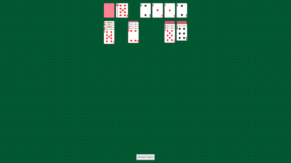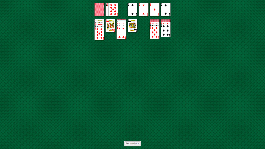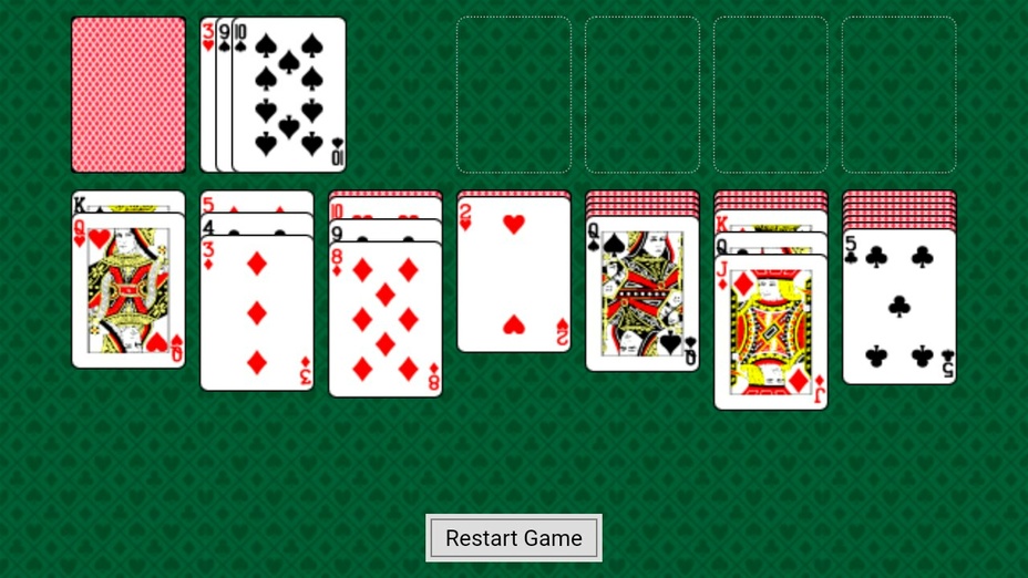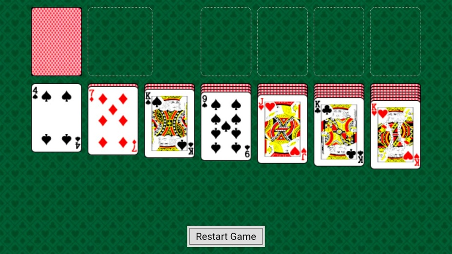 - Mova as cartas entre as colunas do quadro para revelar cartas ocultas e criar sequências descendentes de cores alternadas (vermelho e preto).