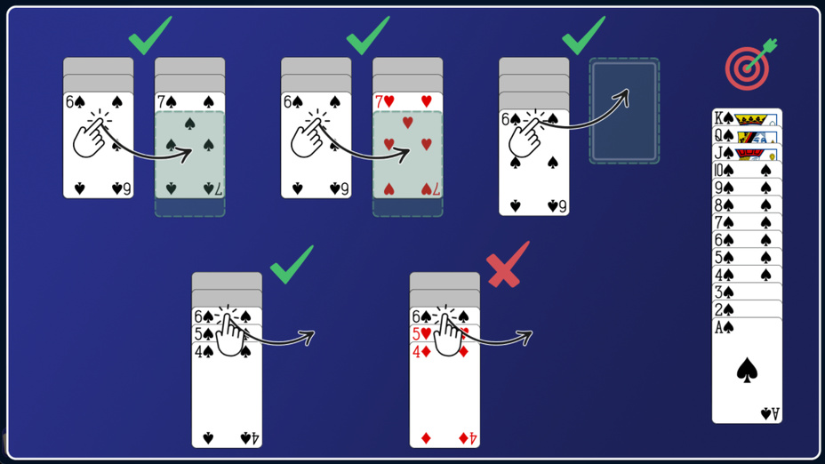 Envolva - se no mundo imersivo de Spider Solitaire-Big Cards seguindo estes passos: primeiro, inicie o jogo no seu computador e familiarize-se com o layout. Comece arrastando as cartas do tabuleiro e colocando-as na ordem apropriada. Lembre-se de que apenas cartas em ordem sequencial podem ser colocadas umas sobre as outras. Em seu telefone, basta tocar e arrastar cartões sem esforço. Sempre fique de olho em possíveis movimentos para evitar ficar sem opções!
