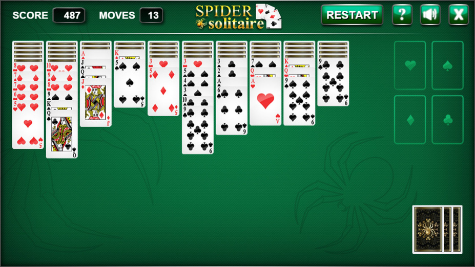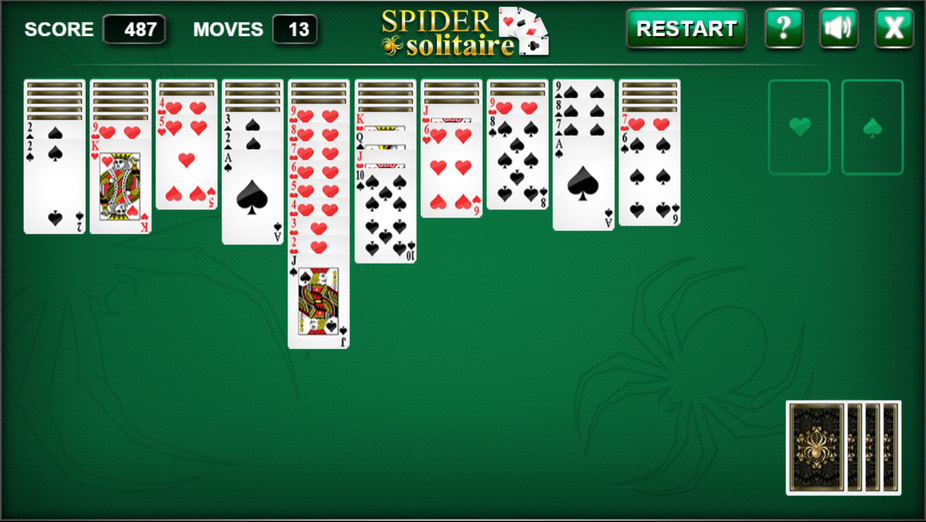 Spider Solitaire é um emocionante jogo de cartas onde seu principal objetivo é remover todas as cartas do campo coletando Royal flushes do mesmo naipe, do rei ao ás. Jogue online gratuitamente sem baixar e mergulhe no fascínio atemporal do Solitário Clássico. Este jogo viciante é perfeito para quem gosta de quebra-cabeças de treinamento cerebral, oferecendo um desafio estratégico em várias plataformas, incluindo desktop, Android e iOS. Com três modos de jogo envolventes, Spider Solitaire atende a todos, de iniciantes a jogadores experientes, garantindo entretenimento sem fim.