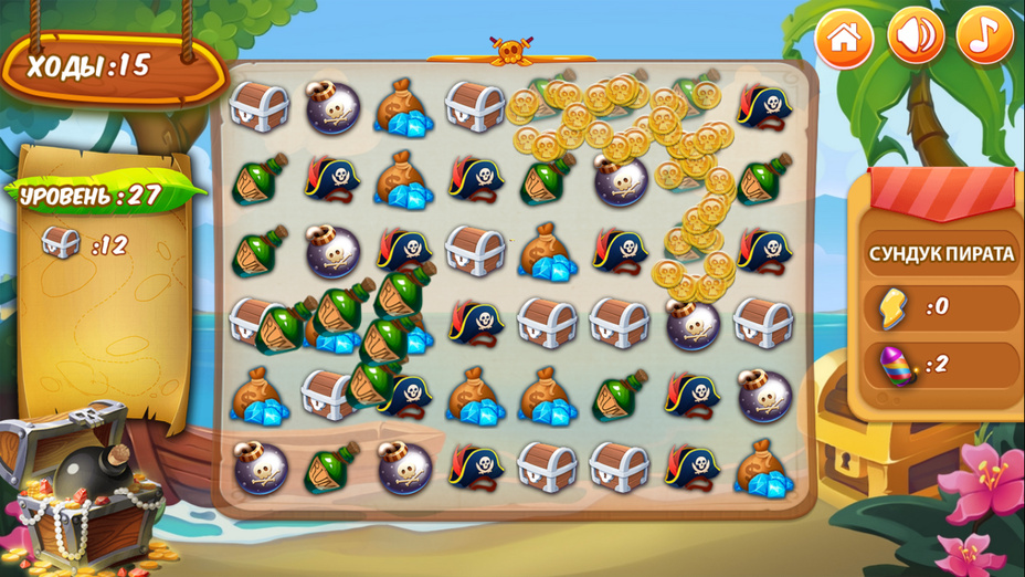 O principal objetivo da Ilha do tesouro é combinar 3 ou mais itens em uma linha para limpar o tabuleiro e progredir através dos níveis, descobrindo tesouros escondidos.