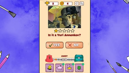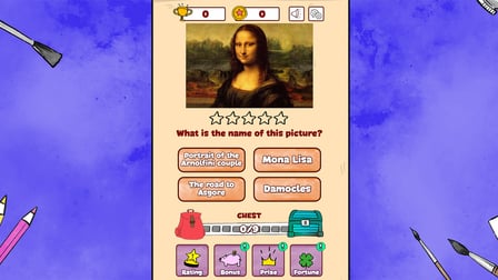Em Trivia Quiz: Pinturas, cada pergunta te puxa para as profundezas da história da arte. De Monet para Manet, você enfrentará desafios que não apenas testam seu conhecimento artístico, mas também enriquecem sua compreensão das obras-primas que moldaram nossa cultura visual. Prepare-se para coletar belos insights enquanto atravessa vários estilos e movimentos de arte!