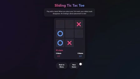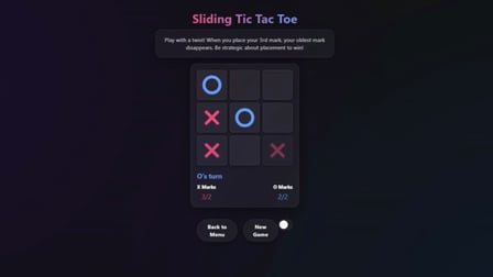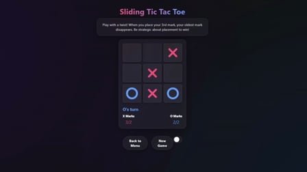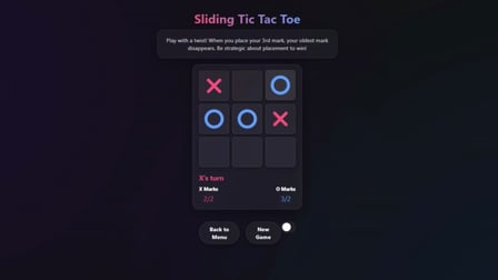Sliding Tic Tac Toe combina a simplicidade do jogo clássico com uma camada adicional de complexidade. O tema principal gira em torno da estratégia e previsão, pois os jogadores devem não apenas buscar alcançar três em uma fileira, mas também gerenciar a natureza mutável de seus símbolos. Este jogo é perfeito para quem gosta de desafios rápidos e estratégicos que exigem tanto pensamento ofensivo quanto defensivo.