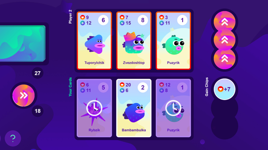 Starten Sie zunächst Aquatic Freaks in Ihrem Browser, entweder auf Ihrem Telefon oder Computer. Sie erhalten zufällig drei Karten. Wenn du an der Reihe bist, spiele eine Karte aus deiner Hand und nutze ihre besondere Fähigkeit, um einen Vorteil zu erlangen. Ihr Ziel ist es, Ihren Gegner zu überlisten und den Sieg zu erringen!