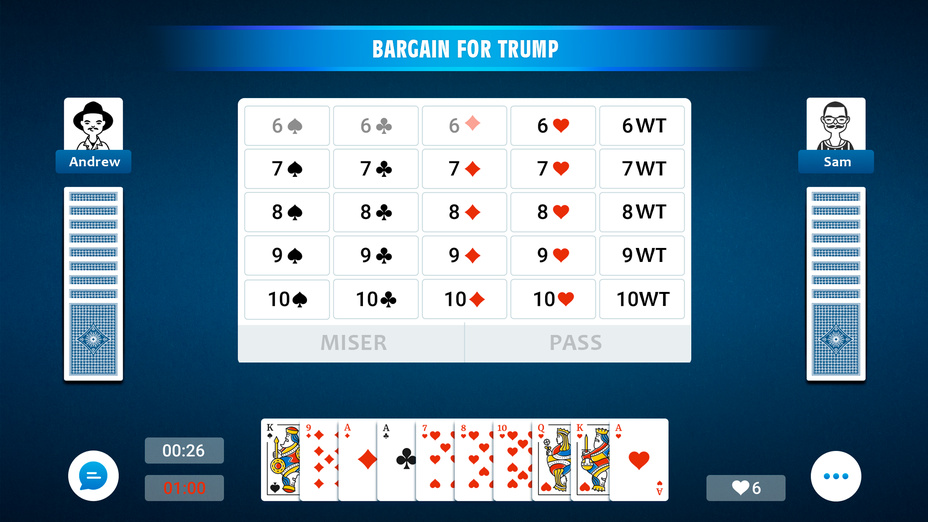 In Azur Preferance übernimmst du die Kontrolle über dein Schicksal in einer Kartenwelt, in der das Hauptziel darin besteht, deine Gegner mit Strategie und Geschick auszutricksen. Sie werden auf unzählige Runden stoßen, von denen jede eine einzigartige Mischung aus Herausforderung und Aufregung bietet, mit verschiedenen Gegnern, die Ihren Mut auf die Probe stellen wollen. Das Spiel verfügt über ein innovatives automatisiertes Punktesystem, das Fairplay und Genauigkeit in jeder Sitzung gewährleistet. Das Spiel wurde für Kartenspielbegeisterte jeden Alters entwickelt, die eine gute Herausforderung lieben und die sozialen Aspekte des Spielens genießen. Ohne Altersbeschränkung lädt Azur Preferance junge und alte Spieler ein, an diesem zeitlosen Klassiker teilzunehmen. Egal, ob Sie ein erfahrener Spieler oder ein lernbegieriger Neuling sind, dieses Spiel bietet eine ansprechende Erfahrung, die jeder genießen kann.