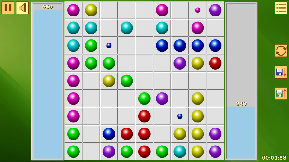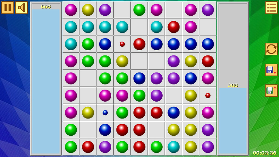 Beginnen Sie damit, Bälle strategisch auf dem Gitter zu platzieren, um Linien von fünf oder mehr derselben Farbe zu erstellen. Mit jedem Zug erscheinen neue Bälle, planen Sie also mit Bedacht, um zu vermeiden, dass das Brett gefüllt wird. Nutzen Sie die Möglichkeit, Ihren letzten Zug bei Bedarf rückgängig zu machen und Ihren Fortschritt zu speichern, um später fortzufahren. Passen Sie den Hintergrund an und wählen Sie Ihren bevorzugten Balltyp, um Ihr Spielerlebnis zu verbessern.