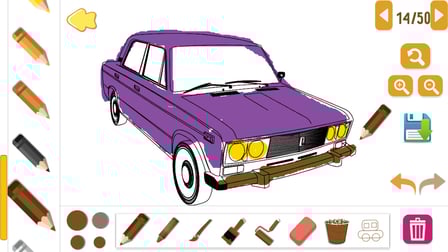 Klicken oder tippen Sie einfach, um eine Farbe aus der Palette auszuwählen, und füllen Sie dann mit der Maus oder dem Finger die dafür vorgesehenen Bereiche der Auto-Malvorlage aus. Um Farben zu löschen oder zu ändern, navigieren Sie einfach zurück zur Palette.