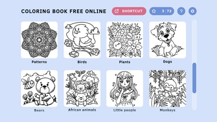 Das kostenlose Online-Malbuch ist benutzerfreundlich gestaltet und stellt sicher, dass Spieler jeden Alters problemlos navigieren und das Spiel genießen können. Wählen Sie zunächst eine Sammlung aus, die Sie fasziniert, und wählen Sie dann ein Bild zum Ausmalen aus. Nutzen Sie die Vielzahl der verfügbaren Werkzeuge, um jedem Bild Ihre persönliche Note zu verleihen.