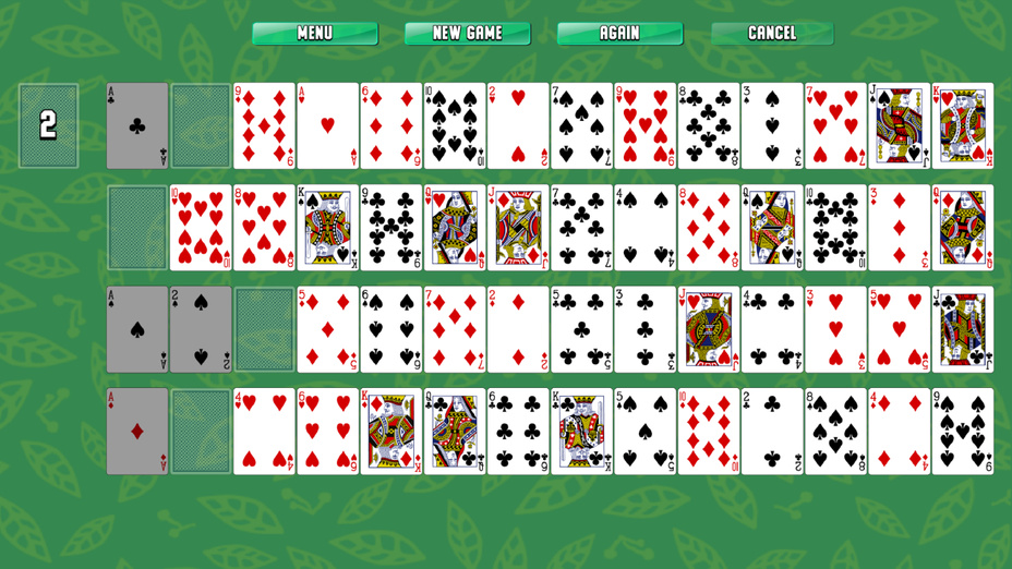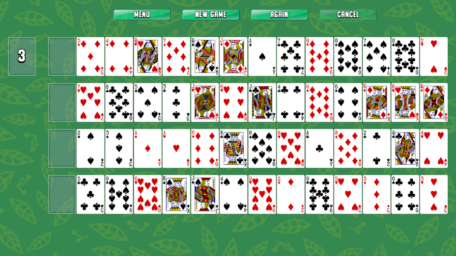 Dieses Spiel konzentriert sich einzigartig darauf, ein teppichähnliches Layout von Karten zu erstellen, wobei suit sequences visueller und strategischer betont werden als bei Standard-Solitaire-Varianten.