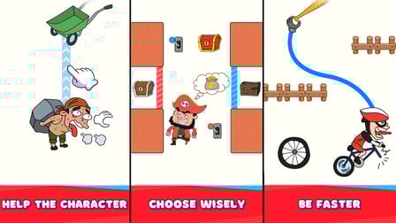 "Hilf mir: Knifflige Rätselgeschichte" ist eine reizvolle Mischung aus Humor und Intellekt. Das Spiel bietet wunderschön gestaltete 2D-Grafiken und eine Reihe amüsanter Szenarien. Jedes Level stellt eine neue Herausforderung dar, bei der Sie den Charakteren helfen müssen, indem Sie die richtigen Werkzeuge auswählen und Hindernissen ausweichen. Die unerwarteten Wendungen und komischen Ergebnisse halten das Gameplay frisch und ansprechend. Dieses Spiel ist perfekt für alle, die eine Mischung aus Denksportaufgaben und unbeschwertem Spaß genießen möchten.