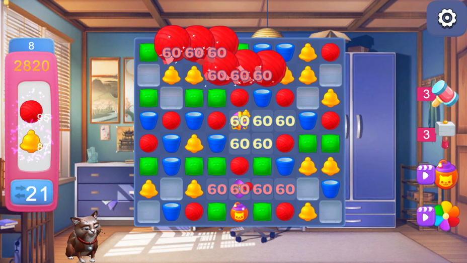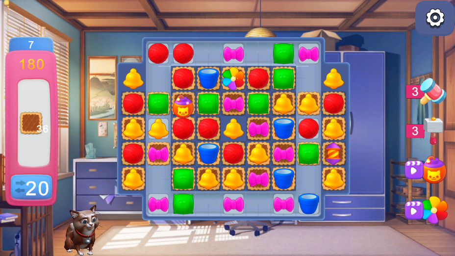 Begeben Sie sich auf Ihr Kätzchen-Match-Abenteuer, indem Sie die Kunst beherrschen, drei oder mehr identische Gegenstände zusammenzubringen, um Ressourcen zu sammeln und Ihre Räume zu dekorieren. Nutze die Power-Ups und Spezialgegenstände, die während des Spiels verstreut sind, um deine Punktzahl zu maximieren und dein Spielerlebnis zu verbessern.