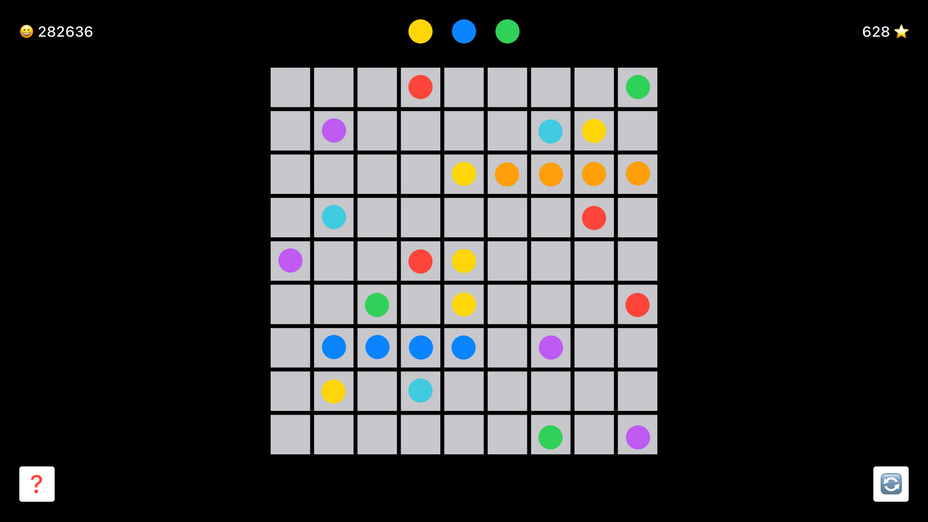 Linien zu spielen 98 Farbige Kugeln auf Ihrem Computer, wählen Sie mit der Maus einen farbigen Ball aus und klicken Sie dann auf eine leere Stelle, um ihn an diese Stelle zu verschieben. Ihr Ziel ist es, 5 oder mehr Kugeln der gleichen Farbe in einer Reihe auszurichten, entweder vertikal, horizontal oder diagonal. Auf Ihrem Telefon, tippen und ziehen Sie einfach den Ball, den Sie bewegen möchten, und tippen Sie erneut auf das Ziel, um Ihren Zug abzuschließen. Die Spieler bewegen abwechselnd Bälle, bis keine gültigen Züge mehr übrig sind. Planen Sie also strategisch, um Ihre Punktzahl zu maximieren!