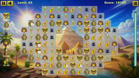 Um Match 3: Ancient Egypt auf Ihrem Computer zu spielen Computer, benutze einfach deine Maus, um zwei benachbarte Edelsteine zu klicken und zu tauschen. Auf einem Telefon, berühren und ziehen Sie, um Edelsteine auf Ihrem Bildschirm auszutauschen. Achte auf den Timer und versuche Gruppen von drei oder mehr Edelsteinen des gleichen Typs zu bilden, um sie vom Brett zu entfernen.