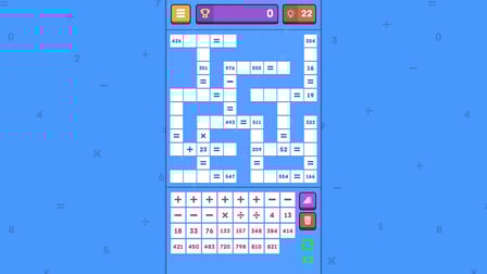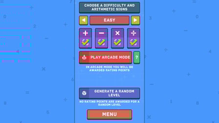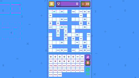 Um sich im mathematischen Kreuzworträtsel zu übertreffen, wählen Sie zunächst einen Schwierigkeitsgrad aus, der Ihren Fähigkeiten entspricht. Schalte die arithmetischen Zeichen aus, wenn du nach einer einfacheren Herausforderung suchst, und schalte sie ein, um deinen Mut zu testen. Im Arcade-Modus werden die Rätsel immer schwieriger, also plane deine Züge sorgfältig. Denken Sie daran, dass Sie den Arcade-Modus jederzeit verlassen und Ihren Fortschritt über das Spielmenü speichern können.