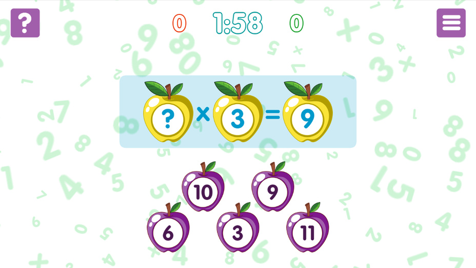A: Verwenden Sie den Übungsmodus, um sich mit den Multiplikationstabellen vertraut zu machen, und versuchen Sie, so viele grüne Äpfel wie möglich für richtige Antworten zu sammeln.