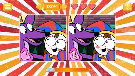 In Pomni und Digital Circus übernimmst du die Kontrolle über Pomni, einen neugierigen und abenteuerlustigen Charakter, der deine Hilfe benötigt, um Rätsel in 20 fesselnden Levels zu lösen. Jedes Level präsentiert ein Paar scheinbar identischer Bilder, und Ihr Hauptziel ist es, die 10 Unterschiede zwischen ihnen zu erkennen. Im Laufe Ihres Fortschritts erkunden Sie eine Vielzahl fantasievoller Orte innerhalb des digitalen Zirkus, von denen jeder seinen eigenen Charme und seine eigenen Herausforderungen hat. Das Spiel ist für Spieler jeden Alters konzipiert, mit einem Fokus auf Kinder und diejenigen, die ein unbeschwertes Rätsellösungserlebnis genießen. Mit seinem intuitiven Gameplay und seiner lebendigen Grafik ist Pomni und Digital Circus eine ideale Wahl sowohl für Solospiele als auch für Familienspaß.