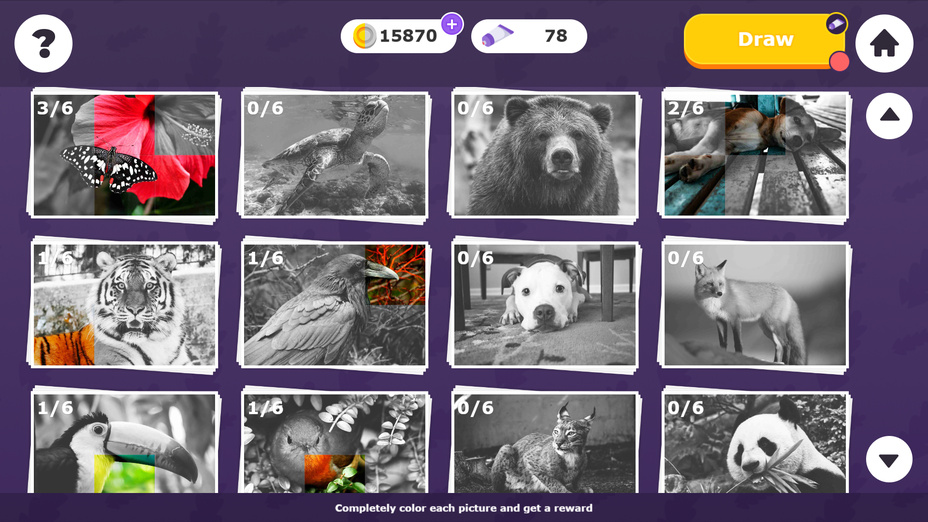 Dieses Spiel verbindet Kunst und Intellekt auf brillante Weise. Die Spieler beginnen mit komplizierten Schwarz-Weiß-Skizzen, die darauf warten, eingefärbt zu werden. Jedes illustrierte Stück bietet eine einzigartige Herausforderung, und wenn Sie die Formen nach und nach mit Farbe füllen, wächst das Erfolgserlebnis. Während im Hintergrund entzückende Musik spielt, können die Spieler ganz in eine Atmosphäre des Friedens und der Kreativität eintauchen und das Lösen von Rätseln in Kunst verwandeln.