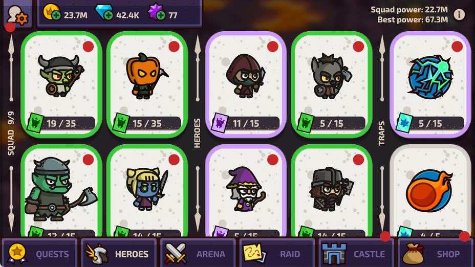 Raid Heroes Dark Side ist ein aufregendes Strategiespiel, in dem Sie als Dunkler Lord und seine Schergen einen epischen Story-Raid beginnen können. Stelle das ultimative Team von Bösewichten zusammen und vernichte deine Rivalen in der PvP-Arena. Spielen Sie kostenlos online ohne Download und tauchen Sie ein in die Atmosphäre strategischer Schlachten und dunkler Fantasie. Erobere neue Gebiete, baue und verteidige deine Festung und überfalle die Burgen anderer Spieler. Dieses Spiel ist die perfekte Mischung aus einem sammelbaren Rollenspiel und einer taktischen Strategie, die Sie am Rande Ihres Sitzes hält. Viel Glück im Kampf!