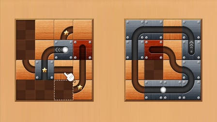 - Kacheln verschieben: Klicke und ziehe die Holzkacheln, um einen freien Weg für die Stahlkugel zu schaffen.
