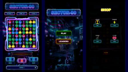 Sector 90 kombiniert klassische Match-3-Mechaniken mit einer einzigartigen Cyberpunk-Ästhetik, die ein visuell atemberaubendes und fesselndes Erlebnis bietet, das seinesgleichen sucht.
