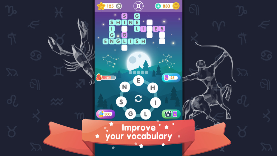 Um loszulegen mit Sternkreuzworträtsel, wählen Sie einfach Buchstaben aus, um Wörter zu bilden, die in das Kreuzworträtselgitter passen. Das Spiel präsentiert verschlüsselte Buchstaben und Ihre Aufgabe ist es, sie in der richtigen Reihenfolge zu verbinden, um gültige Wörter zu bilden. Mit jedem Level steigt der Schwierigkeitsgrad und fordert Sie auf, im Laufe Ihres Fortschritts kreativer und strategischer zu denken.
