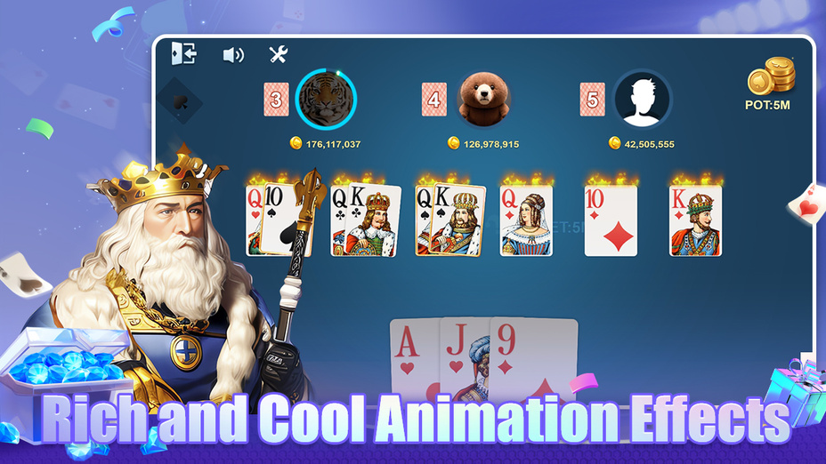 - Ziehe Karten und versuche, deine Gegner auszuspielen, indem du strategisch deine Hand spielst.
