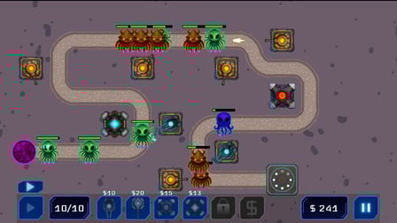 Treten Sie mit Einfachheit in die Action ein. Verwenden Sie Ihre Computer maus, um Türme per Drag & Drop auf das Schlachtfeld zu ziehen, oder tippe auf deine Telefon auswählen und platzieren. Achte auf die Art der außerirdischen Invasoren und passe deine Turmauswahl entsprechend an! Jede Welle wird immer schwieriger, daher ist die Verbesserung Ihrer Verteidigung überlebenswichtig.