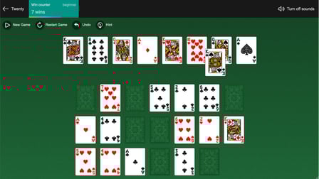 A: Twenty Solitaire verwendet zwei Kartendecks und bietet eine 80% ige Erfolgschance, was es einfacher und angenehmer macht als viele andere Varianten.