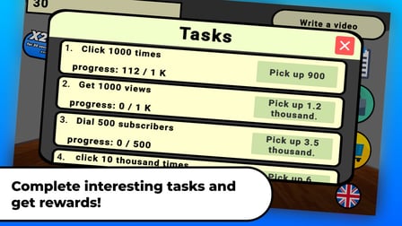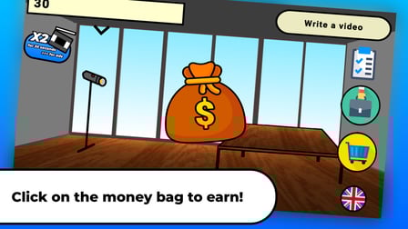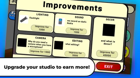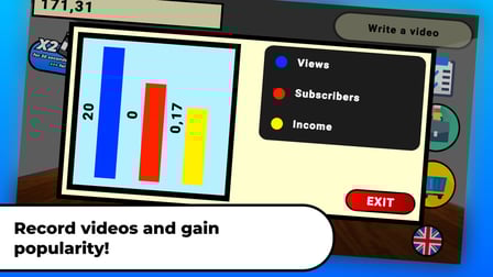 Das Spiel dreht sich darum, Videos aufzunehmen, um Ansichten zu erhalten, durch Klicks Geld zu verdienen, Ihr Studio mit besserer Ausrüstung aufzurüsten und Unternehmen freizuschalten, die auch offline Einnahmen generieren.