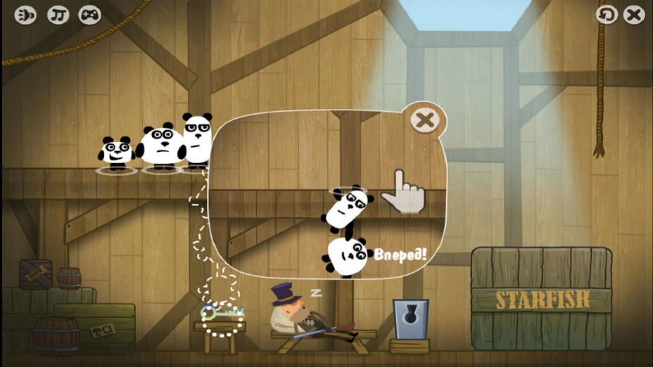 Para controlar el juego: haz clic y arrastra para mover los pandas en tu ordenador, y toca sobre ellos para seleccionar sus acciones en tu móvil. Cada panda tiene habilidades específicas: toca para saltar, haz clic para levantar objetos, o navega por el juego haciendo clic en diferentes lugares.