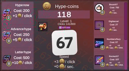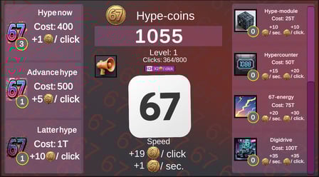 Para jugar a 67 Clicker: Hype, simplemente haz clic en la pantalla para generar monedas de hype. Cada clic te otorga monedas que puedes usar para mejorar el número 67. A medida que acumulas monedas, invéntalas sabiamente para desbloquear nuevos niveles y potenciadores ¡y maximizar tu hype! Puedes jugar en tu ordenador usando el ratón o tocar fácilmente en tu teléfono móvil. ¡Sé estratégico con tus mejoras para convertirte en el maestro del clic!
