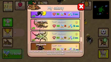 Comenzando con Colonia de Hormigas es sencillo. Recolecta recursos dispersos por el mapa y llévalos de regreso a tu colonia. A medida que acumules recursos, puedes mejorar tus hormigas y capturar otras criaturas para reforzar tu ejército. Usa maniobras estratégicas para atacar a otras colonias y defenderte de las hormigas enemigas. Los controles intuitivos y la interfaz fácil de usar facilitan a los jugadores de todas las edades sumergirse en la acción.
